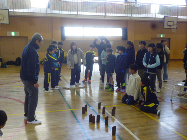 二名小学校区スポーツ協会主催の「モルック」の競技が二名小学校体育館で行われました。